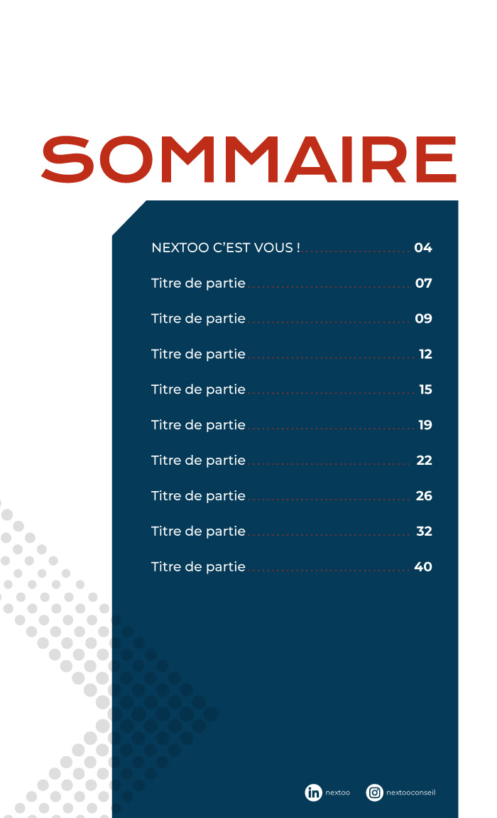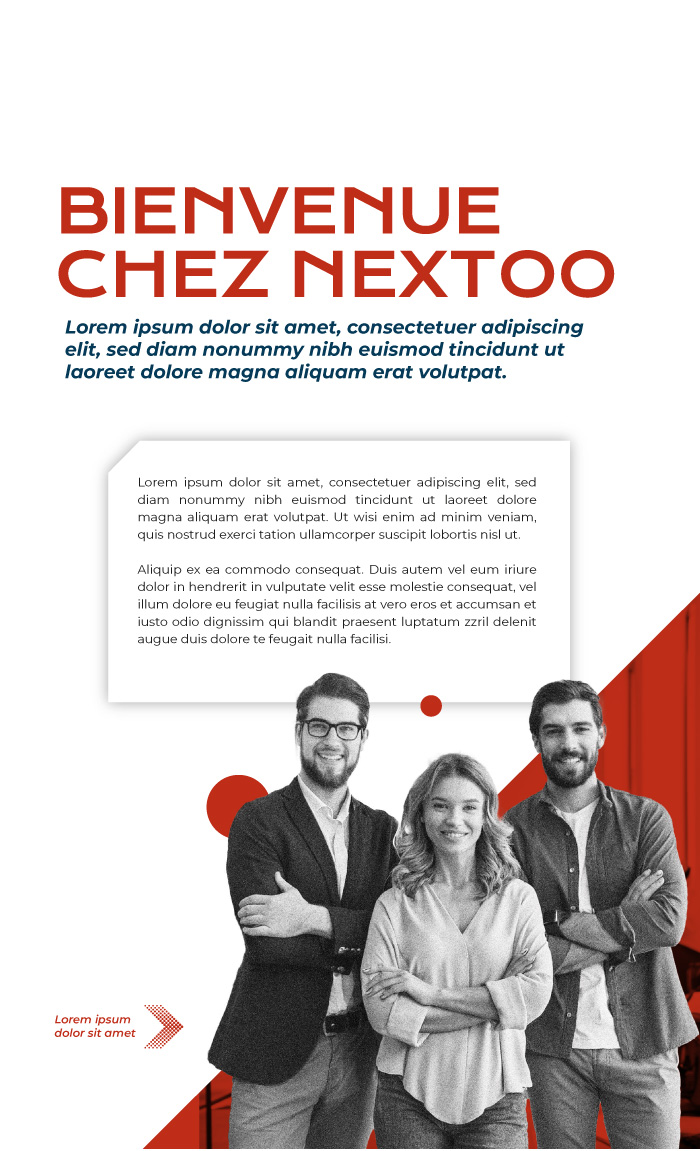 Pour NEXTOO, acteur de la conception et du développement d’applications et de sites internet, j’ai conçu un template complet pour leur livret d’accueil. Un travail qui a consisté à créer les différentes pages types qui constituent le document (présentation, process, équipe, valeurs…), en veillant à harmoniser l’ensemble avec leur identité visuelle, assurer une lecture claire et structurée, proposer un support professionnel et réutilisable par leurs équipes.